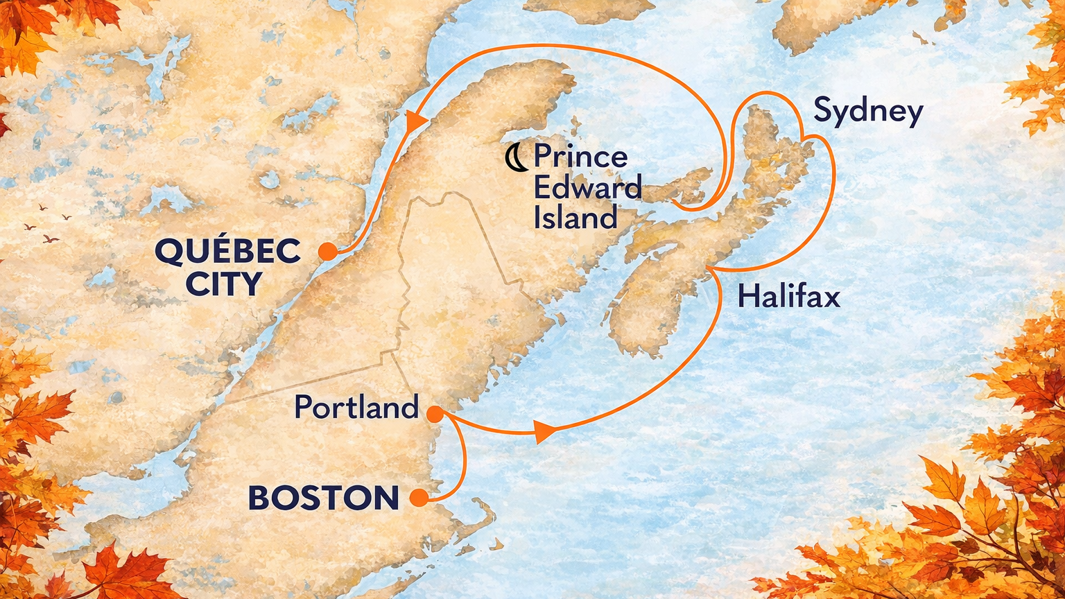 Sail north in the golden light of fall, where crimson shorelines meet slate-blue water and harbor towns glow with harvest color aboard this refined, mid-sized ship. Savor fresh lobster, warm chowder, maple sweetness, and hot cocoa as crisp air brushes your cheeks. Listen to church bells in Québec, buoys rocking in quiet coves, and wind moving through trees along the coast. Wrapped in layers and unhurried rhythm, this journey invites you to travel with intention — held by beauty, water, and the beauty of the season.